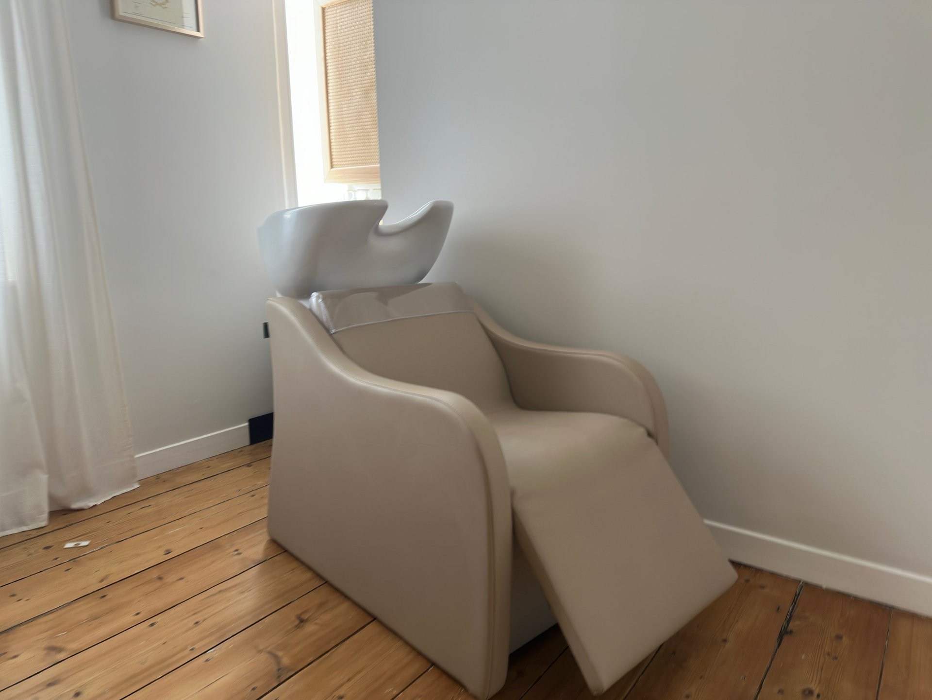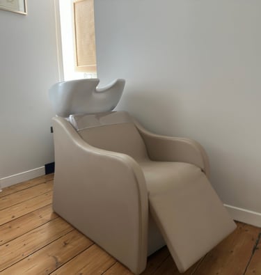 Une entrée discrète et chaleureuse — Une maison de ville avec une porte bleue, sans vitrine. Vous sonnez, je viens vous ouvrir. Je vous débarrasse de votre manteau, je vous propose des chaussons, et je vous accueille avec un thé ou un café. Ensuite, vous traversez mon espace de vie (oui, vous verrez mon salon et ma cuisine !) et vous arrivez dans VOTRE bulle : une chambre de coiffure aménagé spécialement pour vous. (Petite info pratique : l'accès se fait par escaliers, sans aménagement PMR — n'hésitez pas à me contacter si besoin.)